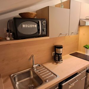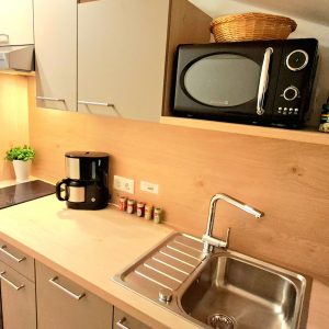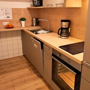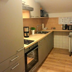 • Küche mit Backofen, Herd mit zwei Cerankochfeldern, Microwelle, Kühlschrank mit Gefrierfach,