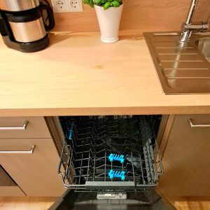 • Küchenausstattung mit Toaster, Geschirrspülmaschine, Kaffemaschine und Wasserkocher